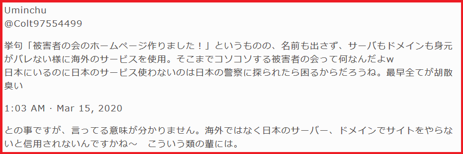最後に。ツイッターの匿名アカウントの人は、被害者の会の人たちは当然誰だか分かっているはずです。これだけ自分のことを「私はどこそこの誰々でございます」と言ってしまっている匿名アカウントを私は見たことがありません。元学生さんたちがことを荒らげず、大人な対応をしているということです。匿名アカウントのご本人は元学生さんたちをゲームばっかりやりやがってどうこうと罵っていますが、知恵や判断力、人間性という意味では、この匿名アカウントのご本人の方が遥かに劣ります。というか致命的なまでに問題があります。ただまだ若いので、気づくこともあると信じたいです。