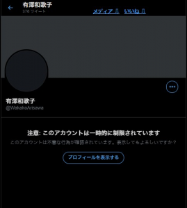 半日で40回もツイートしたキリロム工科大学東京支社社長の有澤和歌子氏のアカウントが停止されていました。