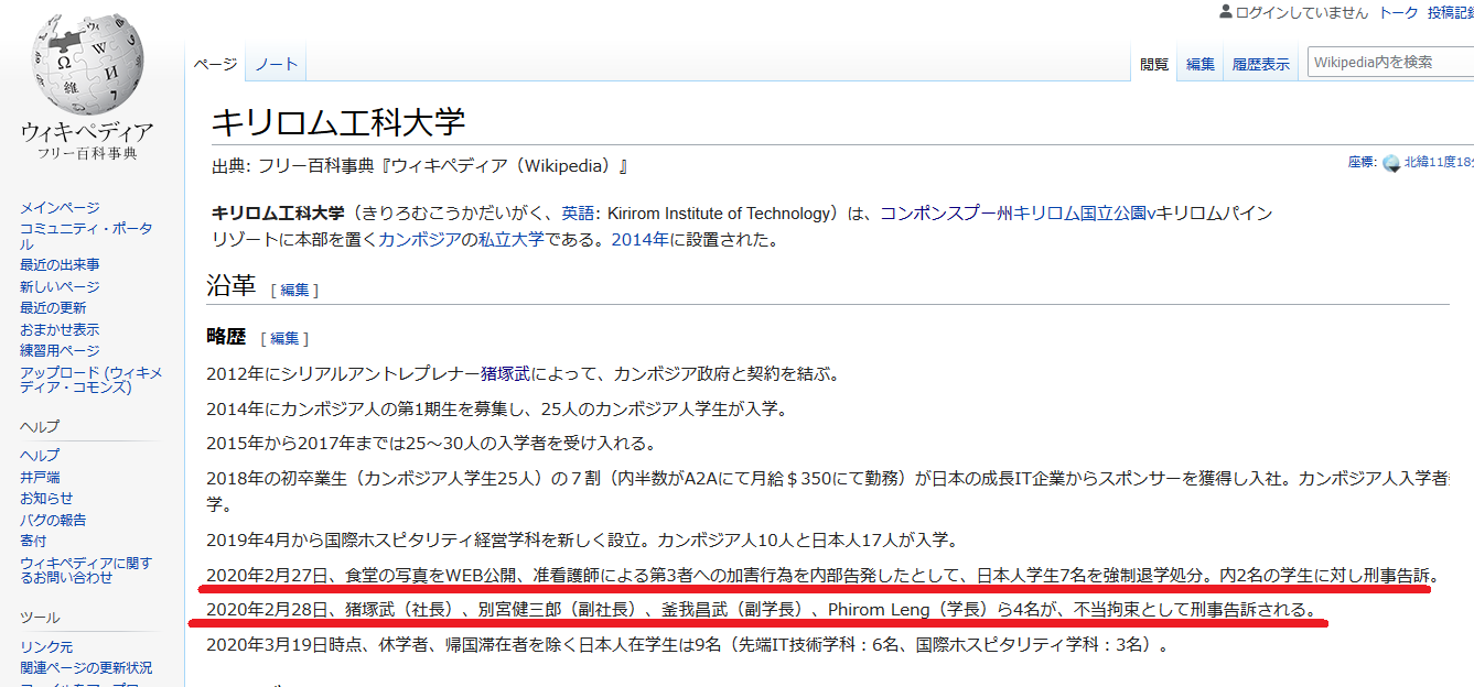 前回の私のブログ記事 「ウィキぺギアにキリロム工科大学猪塚武の刑事告訴」からですが、何者かによって文章が編集されています。