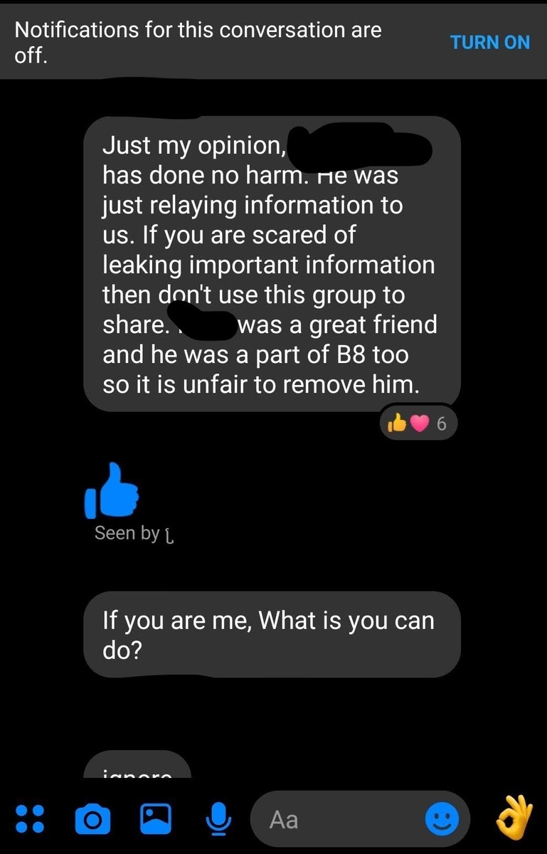 訳「これは僕の意見だけど、彼(日本人学生)は何も加害しているわけじゃない。ただ情報提供しただけだ。もし情報漏えいが怖いなら重要な情報をここに流さなければいい。彼はB8の一員で、素晴らしい友人じゃないか。なのにこのグループから除外するのは不公平じゃないか。」(カンボジア人学生)