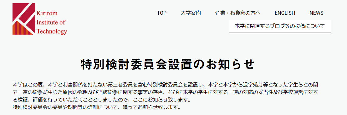 「特別検討委員会設置のお知らせ」をキリロム工科大学公式HPに投稿しました。