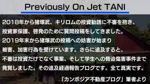 「女性の名前と顔をブログやYoutubeで公開し、将来を台無しにするようなブログの著者の行動は日本・カンボジアのどちらの国の法律においても正当化されるとは思いません。 」(猪塚)