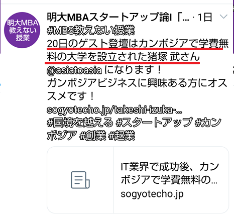 明大MBAスタートアップ論 20日のゲストはカンボジアで学費無料の大学を設立された猪塚武、IT業界で成功後。。。