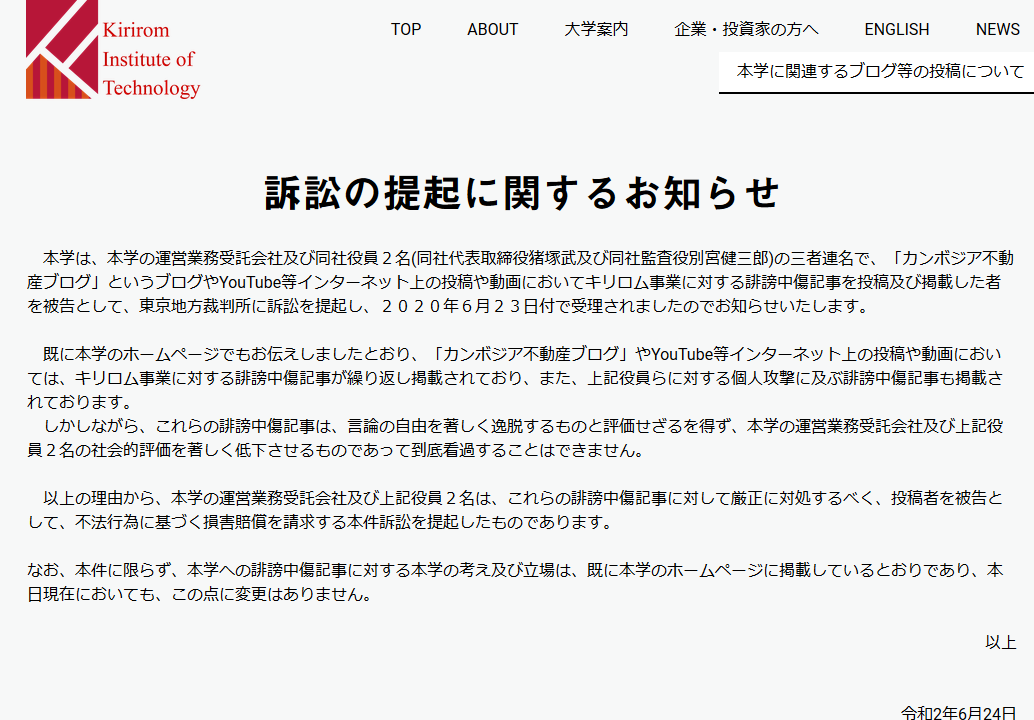 キリロム工科大学の公式HPに「訴訟の提起に関するお知らせ」と投稿があり、当「カンボジア不動産ブログ」の筆者 私に対して東京地方裁判所に訴訟を提起し、2020年6月23日付で受理されたと本日24日投稿がありました。
