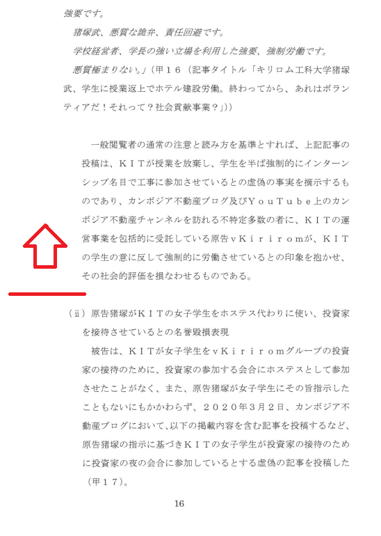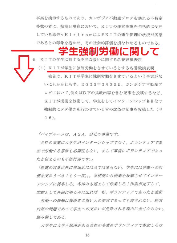 ii KITの学生に対する不当な扱いに関する名誉毀損表現(i)KITが学生に強制労働をさせているとする名誉毀損表現被告は、KITが学生に強制労働をさせているという事実がないにもかかわらず、2020年2月25日、カンボジア不動産ブログにおいて、例えば以下の掲載内容を含む記事を投稿するなど、KITが授業を放棄して、学生をしてインターンシップ名目化で強制的にタダ働きを行わせている旨の虚偽の記事を投稿した(甲16)。