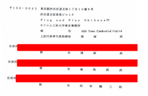「俺は東京事務所で訴状を受け取ったが、vKilirom Japanの社員であってA2Aタウンカンボジア(キリロム工科大学)とは関係ない。だから訴状をカンボジアに送り直すべきだ!」(安田幸正 最高財務責任者)