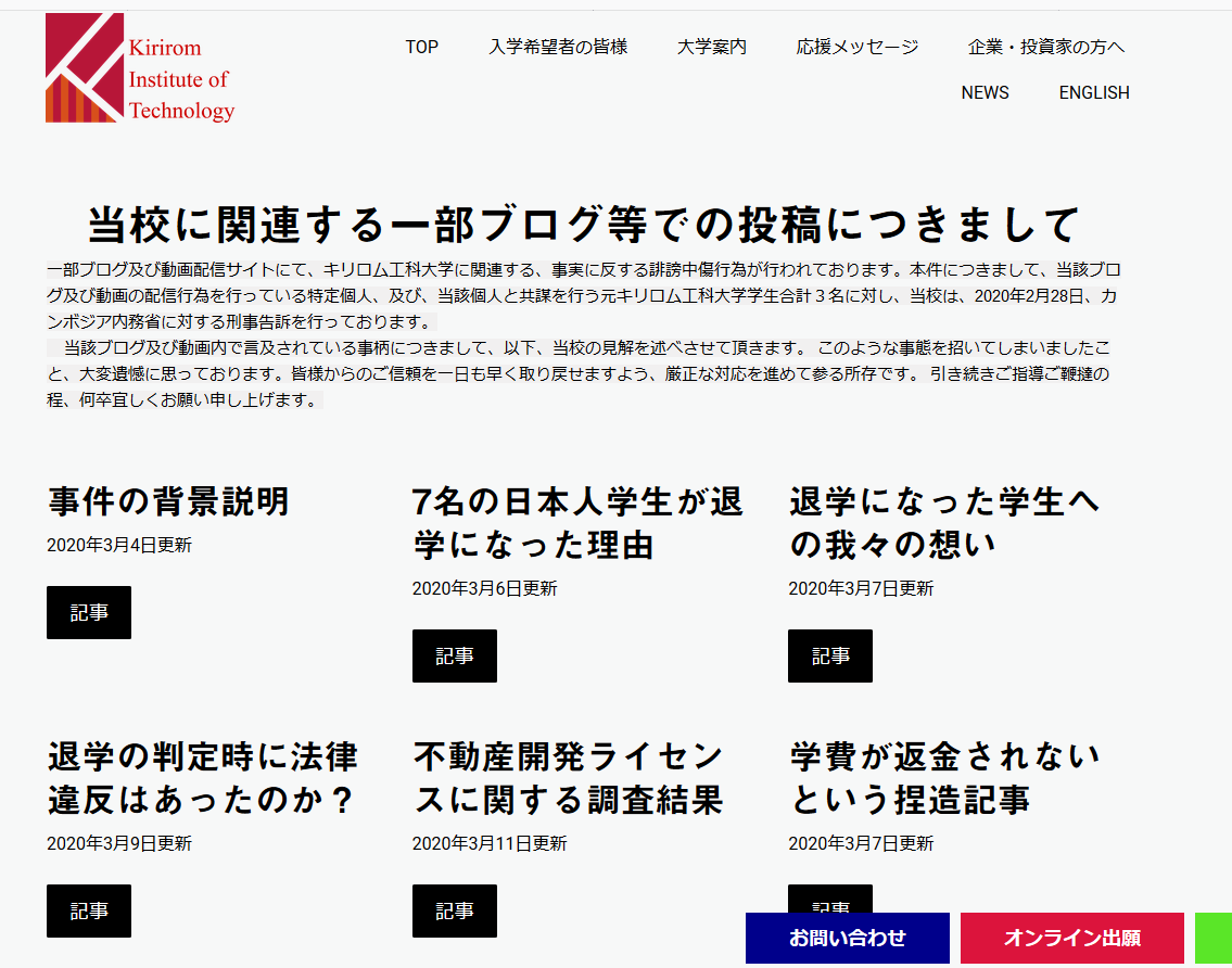 2020年3月、キリロム工科大学HPでブログ筆者のブログ、youtubeの発信内容を虚偽、誹謗中傷と自己弁護の投稿し始める。