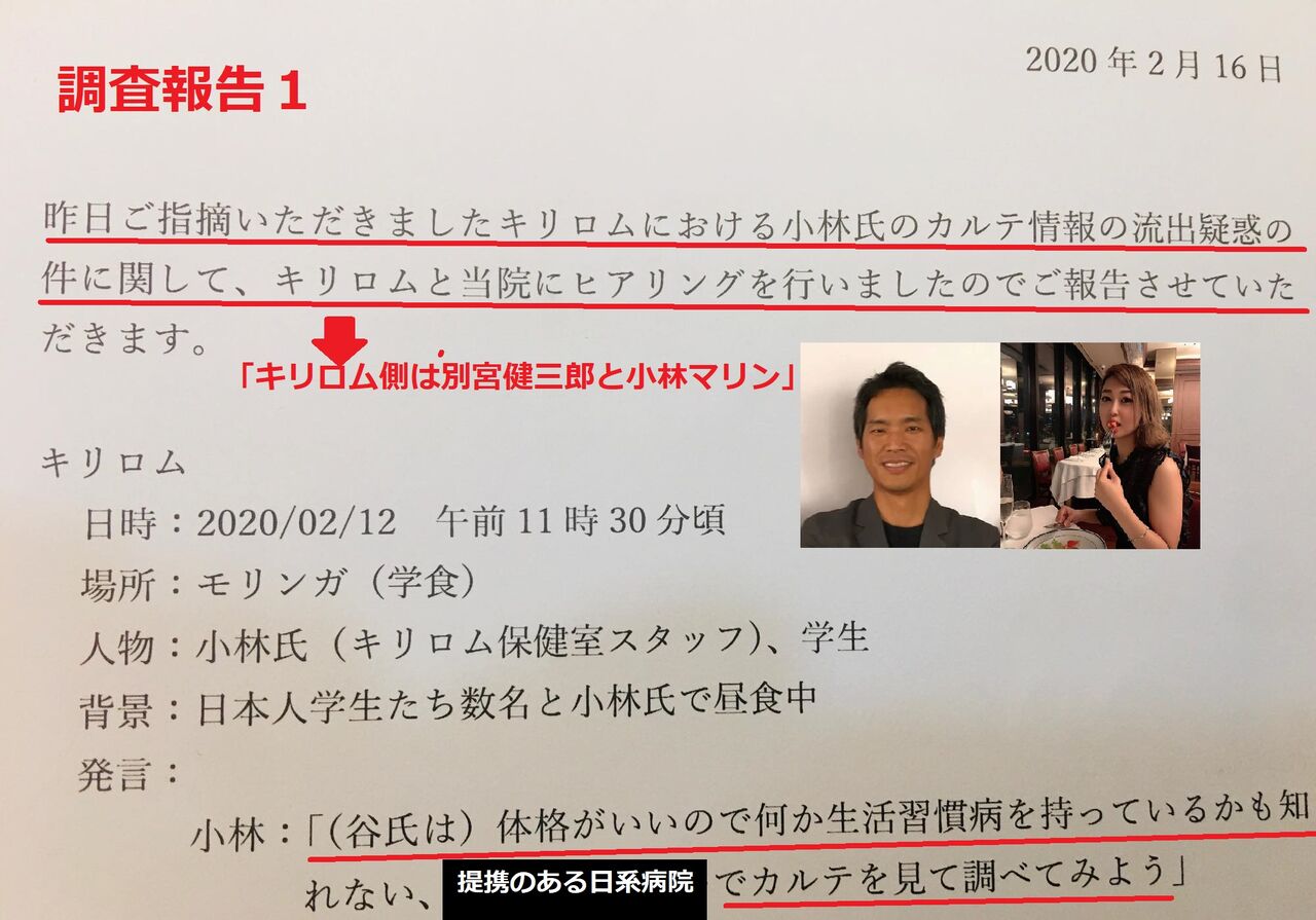 2020年2月16日、提携日系病院がキリロムに出向き、別宮健三郎、小林マリンから事情を聴き取り。小林マリンは事実関係をほぼ認める。